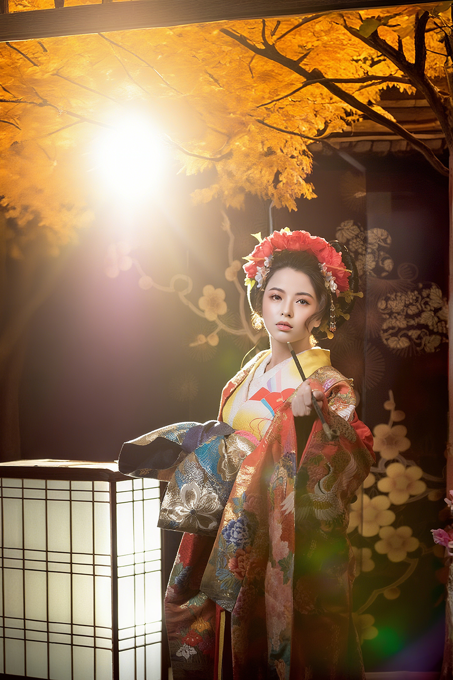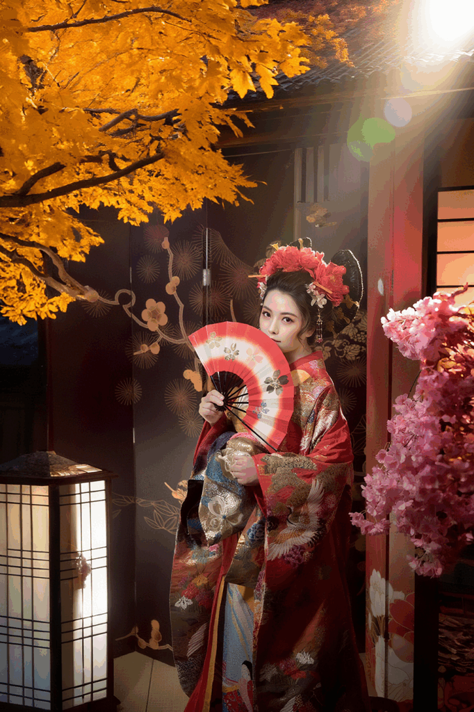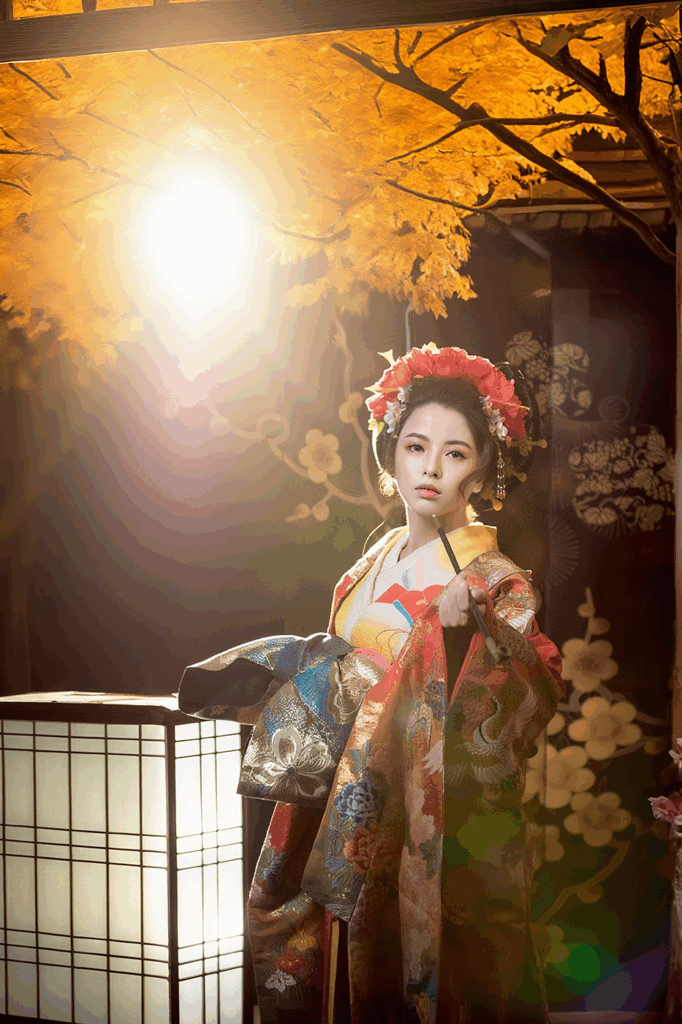 以華麗和服、絢爛妝容與光影交織,