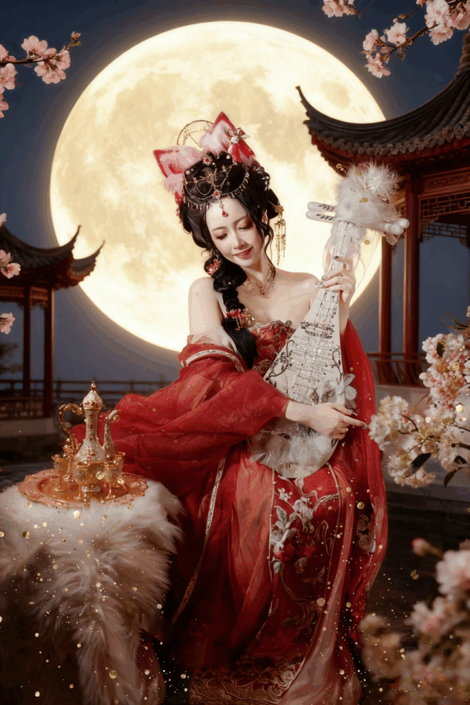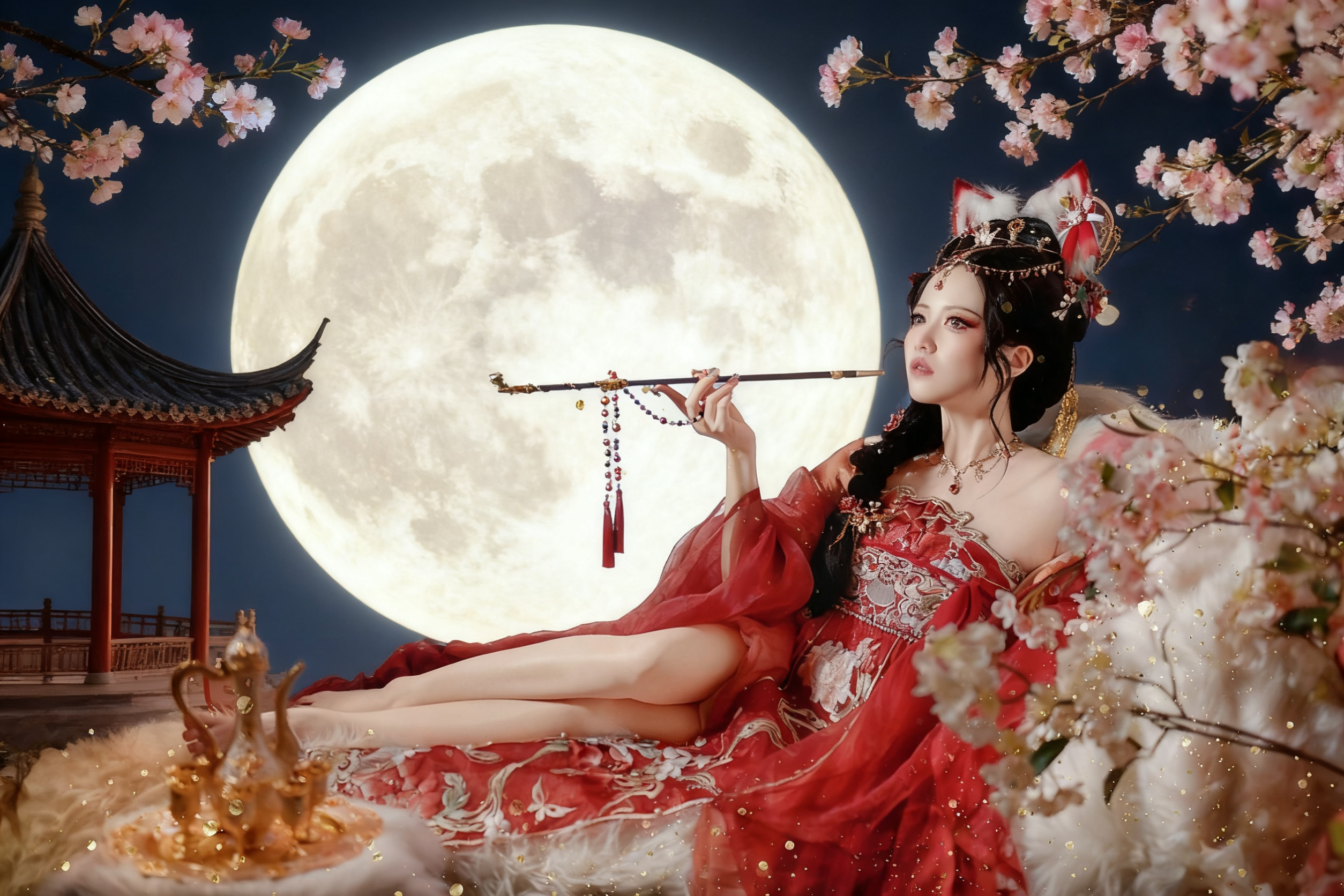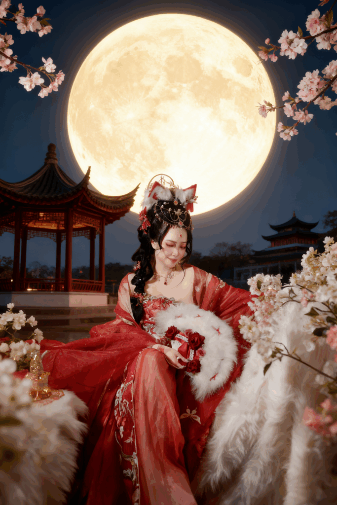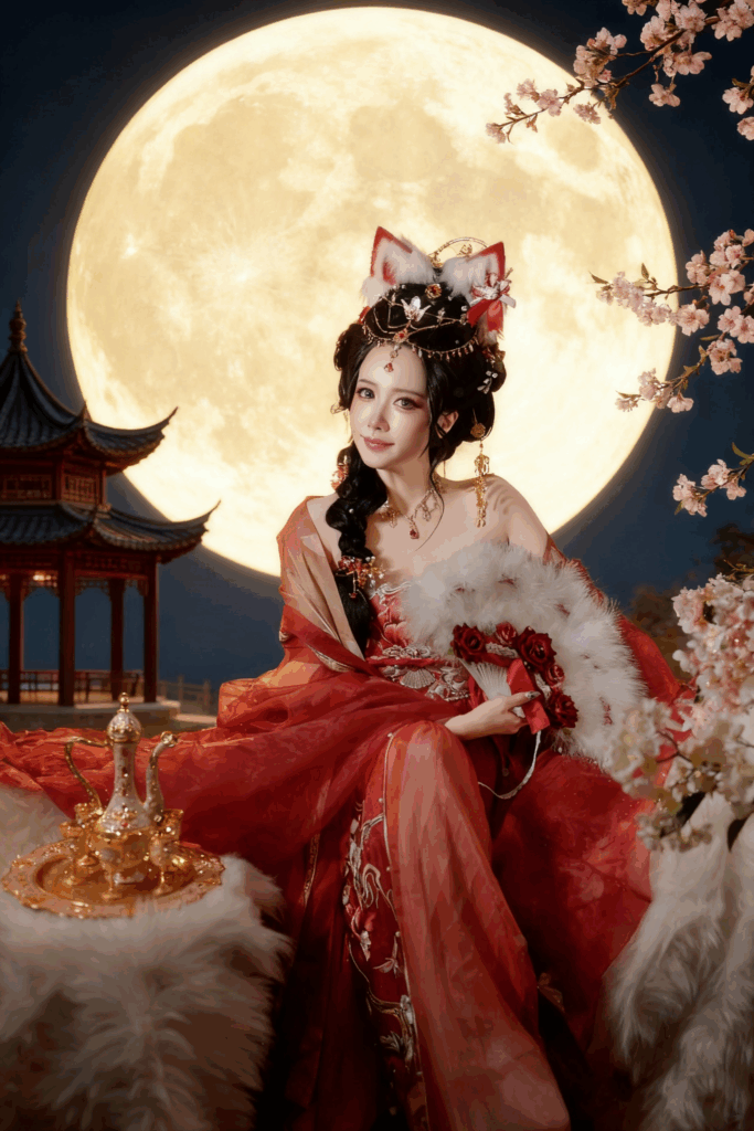 中秋快到了,月亮最圓最美的時候,也是最適合穿上古裝,留下浪漫倩影的時刻,一襲紅裳,搭配精緻髮飾,在滿月與櫻花下拍攝,就像走進了古代的畫卷,舉手投足間就是一種古典的優雅。