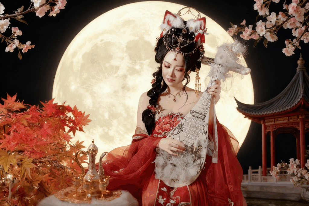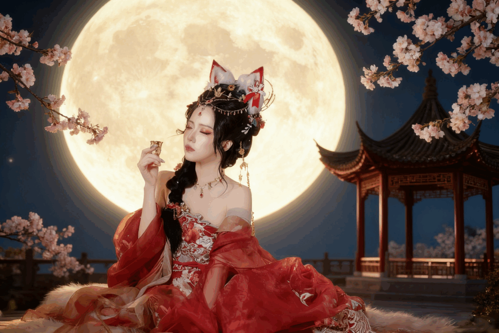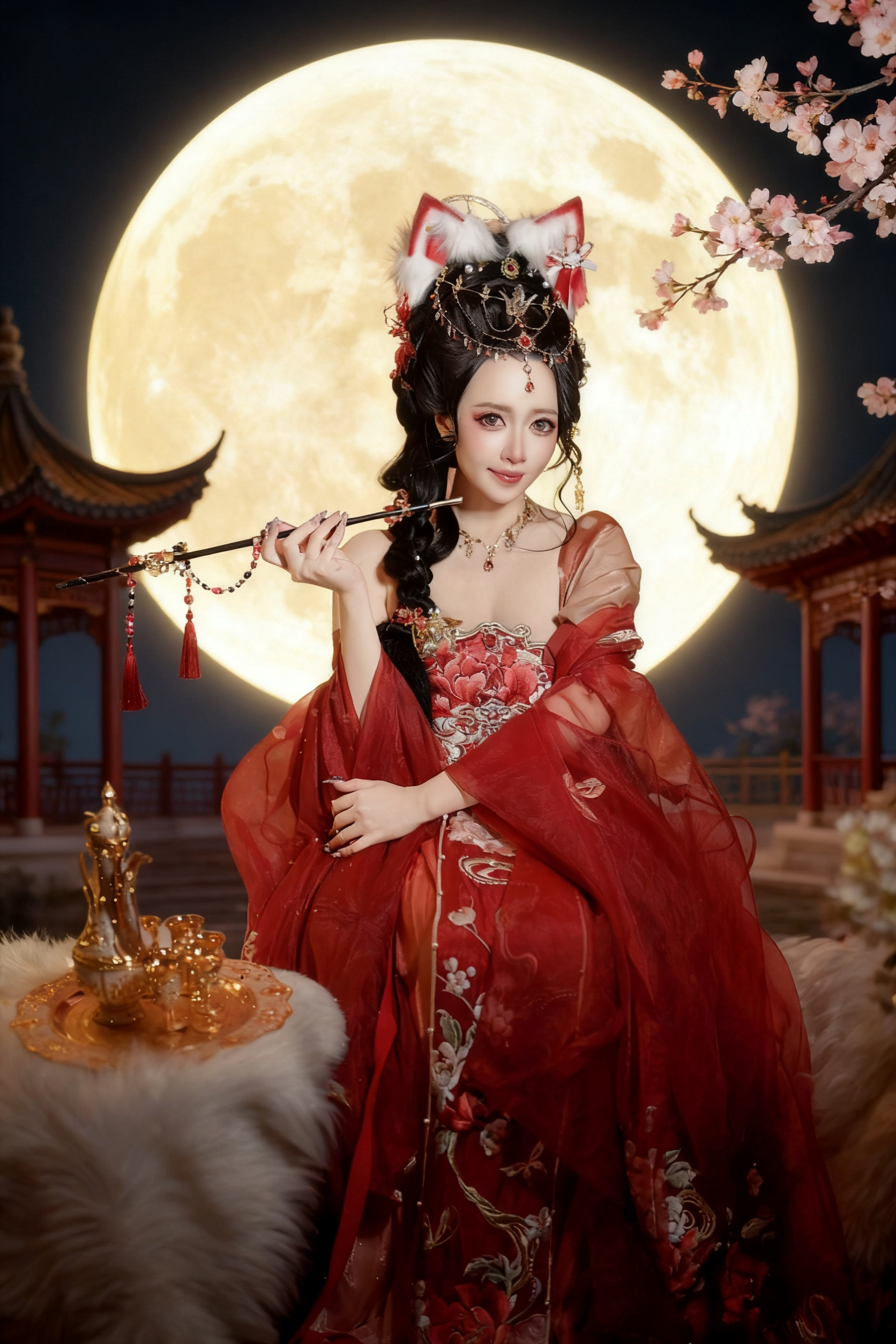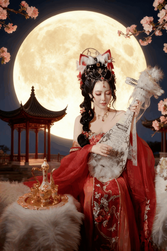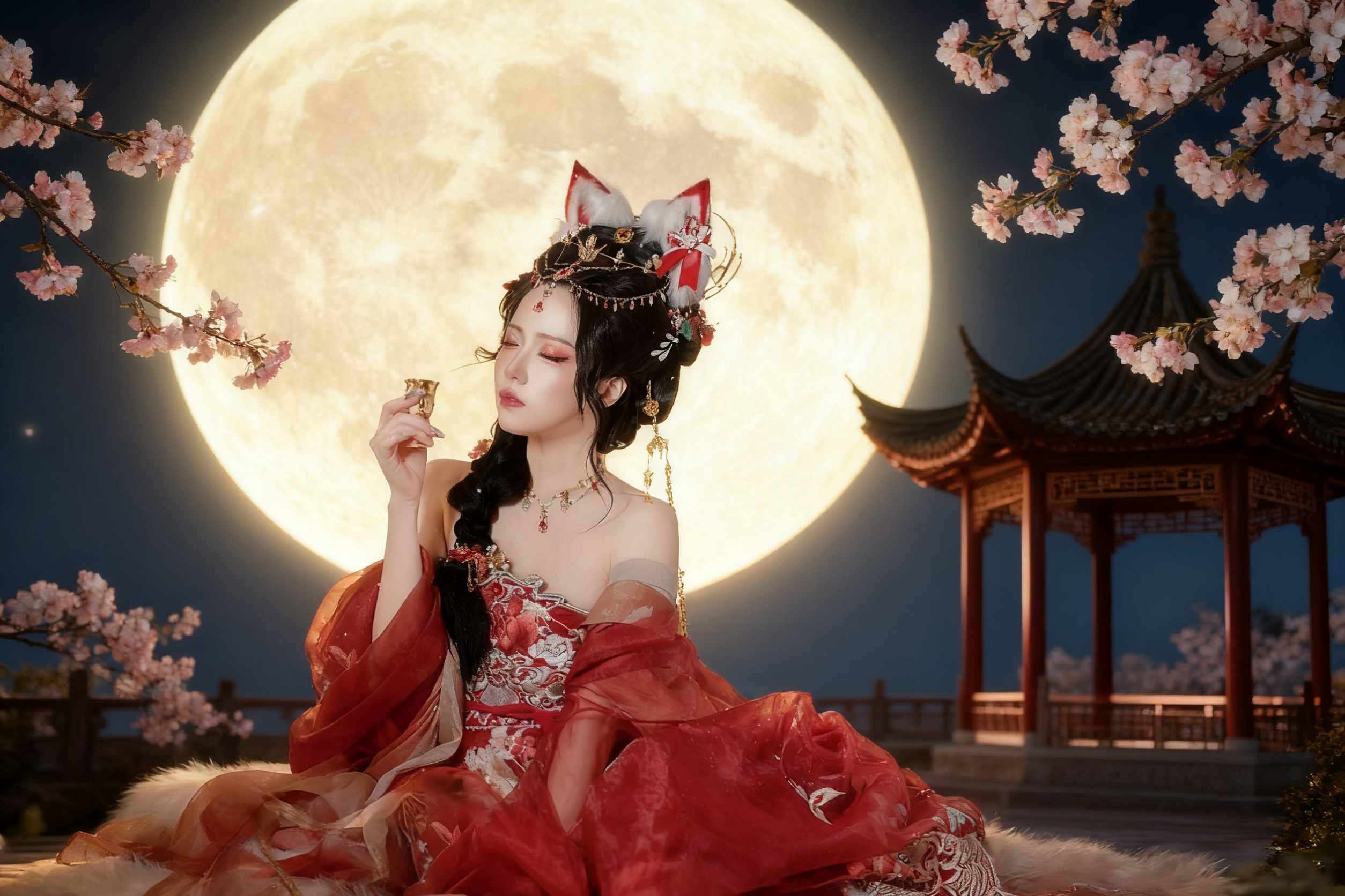 中秋快到了,月亮最圓最美的時候,也是最適合穿上古裝,留下浪漫倩影的時刻,一襲紅裳,搭配精緻髮飾,在滿月與櫻花下拍攝,就像走進了古代的畫卷,舉手投足間就是一種古典的優雅。